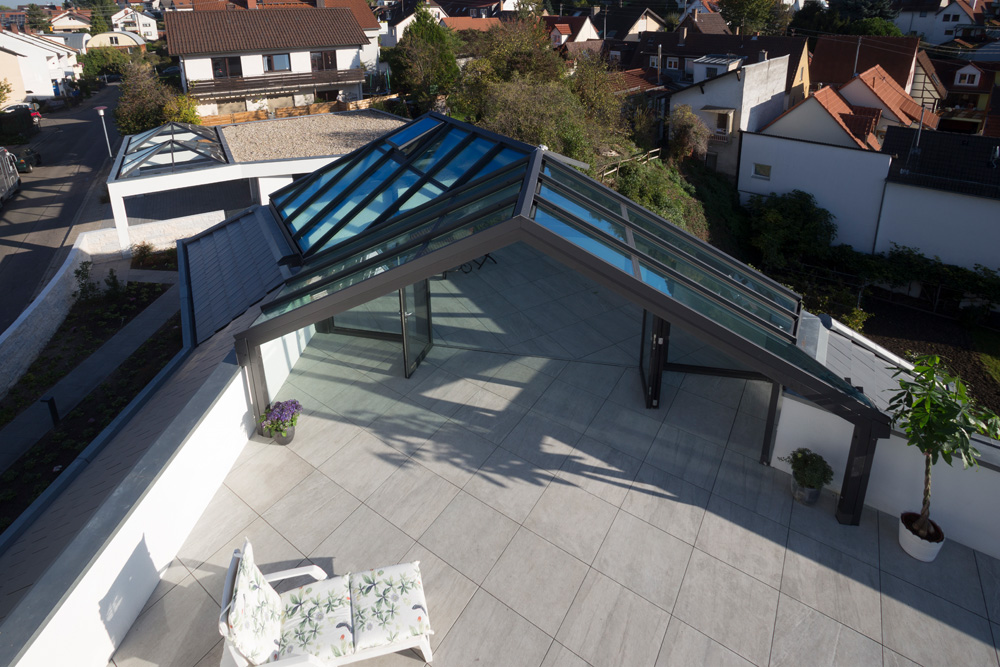 Eine schräge Terrassenüberdachung hat einen Neigungswinkel von bis zu 45 Grad. Vor allem bei „Wetterseiten“ bietet sich dieses Dach an, um die Terrasse und die Wände darunter besser zu schützen.